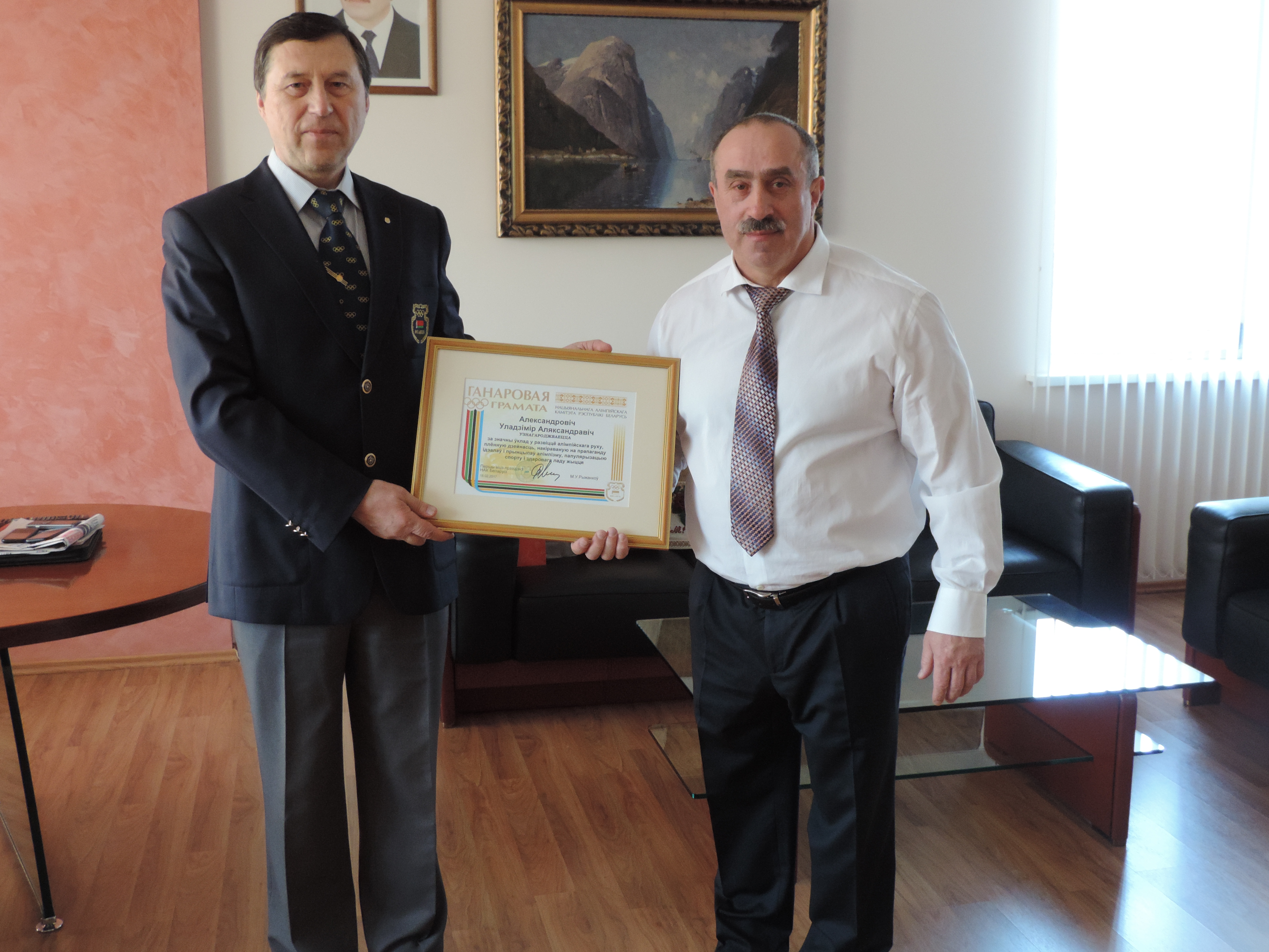Вручение председателю ОО "БФБФ", Владимиру Александровичу, почетной грамоты Национального олимпийского комитета Республики Беларусь, "За значительный вклад в развитие олимпийского движения, плодотворную деятельность, направленную на пропаганду идеалов и принципов олимпизма, популяризацию спорта и здорового образа жизни!".